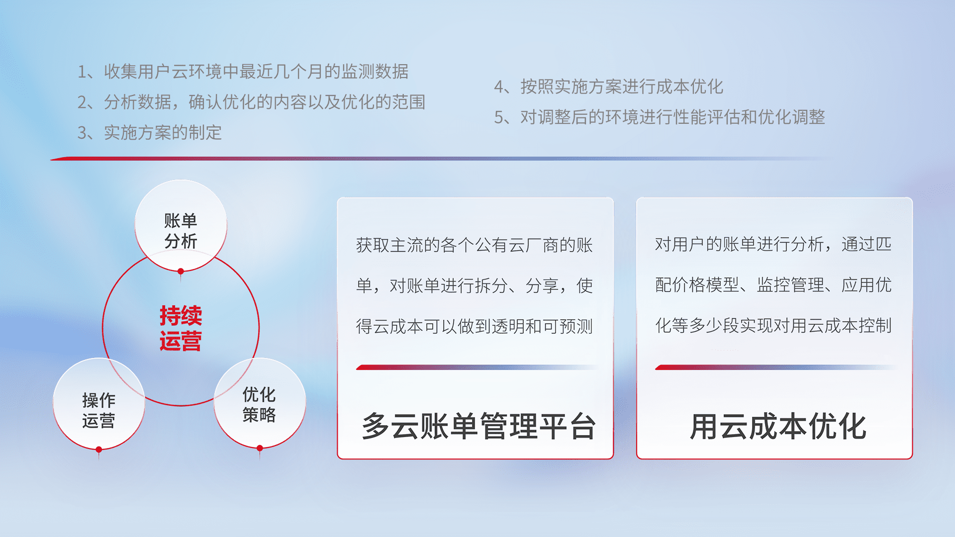 通过多云纳管,,,,以统一的资源数据模型把客户的云资源进行抽象和封装,,进而实现对多云资源的统一操作,,,,保障云资源管理的可靠性、、稳定性与可用性。。。。量身定制化运维内容,,,,配置、、开发运维、、补丁管理、、备份、、监控、、认证和访问管理、、、、审计和日常巡检等,,,,保障在用云过程中的可靠度,,稳定度以及高可用率。。